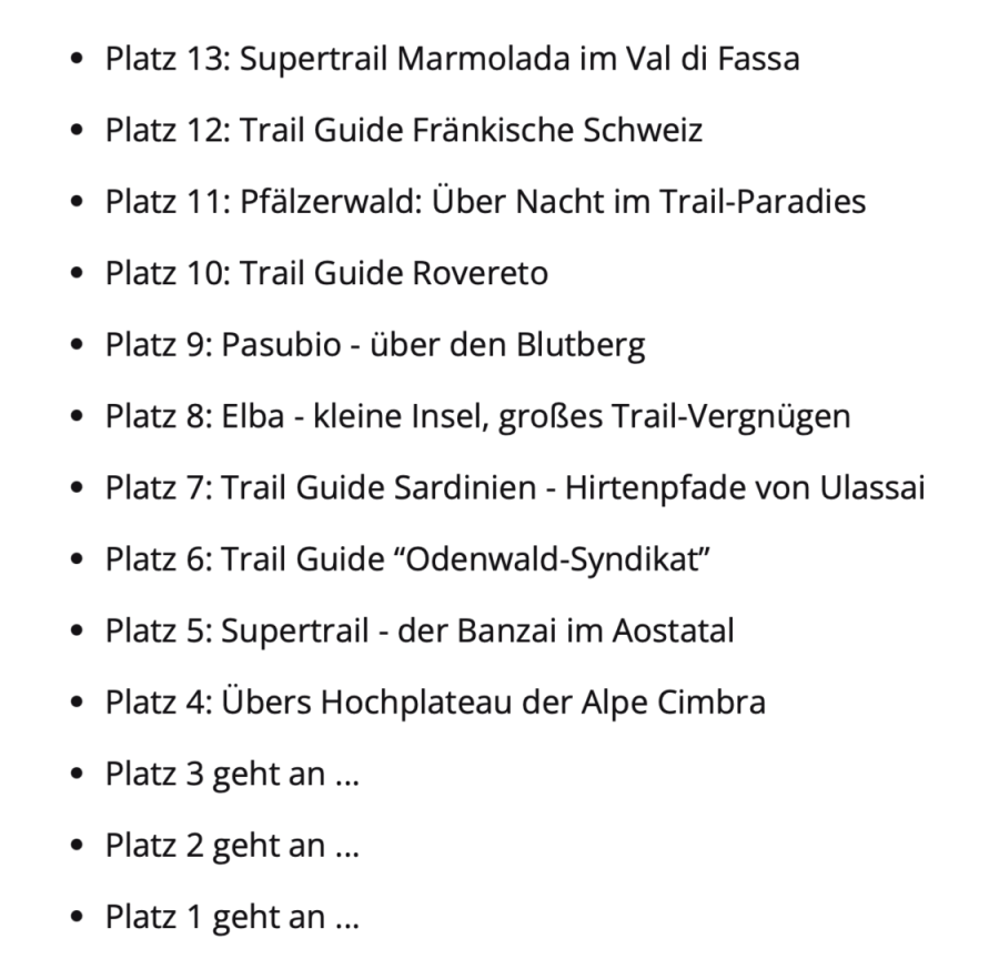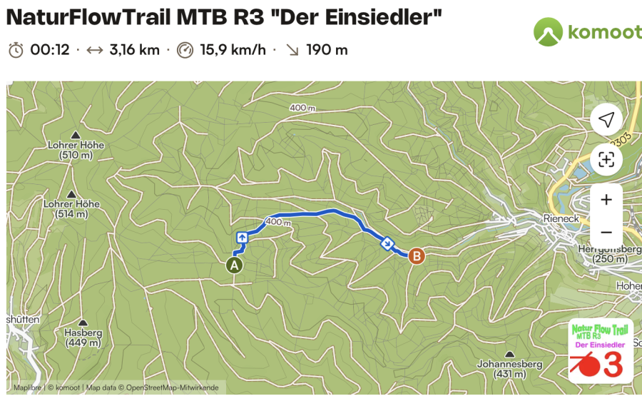| Fahrtechnik | perfekte Bike-Beherrschung mit Trial-Techniken nötig, wie das Versetzen des Hinterrades in Spitzkehren |